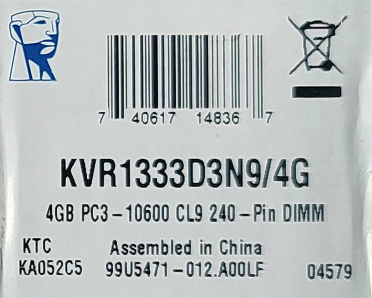 Продаю оперативную память Kingston Value RAM KVR1333D3N9/4G для настольного ПК (DIMM 240 pin, DDR3, 1333 МHz, CL9, 1.5 V, 4 GB) 2 шт. по 600 ₽.